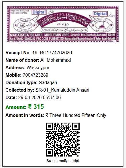 इस QR Code को स्कैन करके कोई भी शख़्स यह तस्दीक़ कर सकता है कि यह रसीद सिस्टम में दर्ज है और किस शख़्स ने कितनी रक़म मदरसे के लिए दी है।